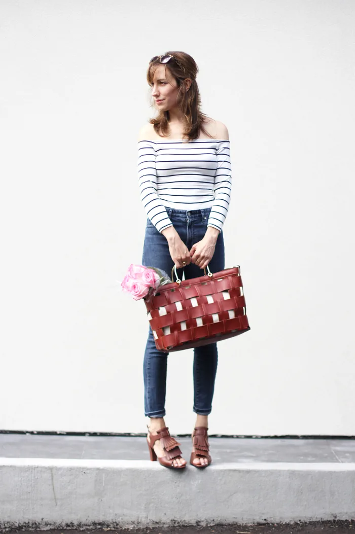 Brown Fringe Sandals: Ssh-oes (also similar below), Off the Shoulder Stripe Top: H&M, Weave Bag: Zara, Skinny Jeans: old (similar below), Maniure & Pedicure: Jamberry Nails