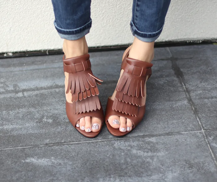 Cutest thing about these sandals is their three layers of kiltie-like fringe, giving them a ton of depth and extra interest. A dowdy pair of brown heels these are definitely not! They also come in brown 🙂