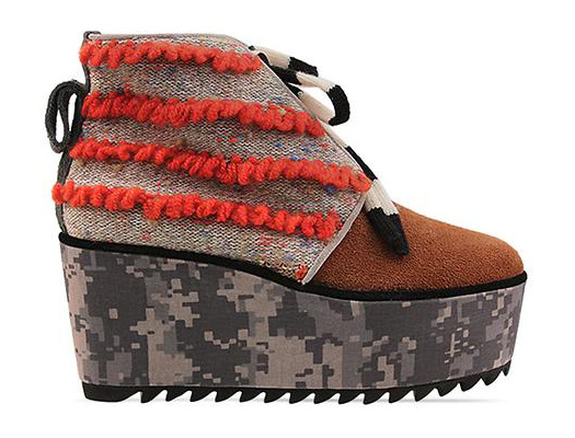 I'm just confused as to how the black & white tube laces, tweet fabric, blah brown suede upper with a pixelated camo flatform aesthetically combine onto a Camilla Skovgaard-like outsole. The orange yarn loops are to me the most puzzling. DIY WTF much?!