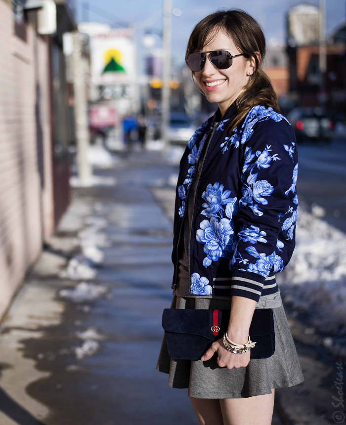 Reminiscent of that blue English pottery print, which inspired Roberto Cavalli‘s collections a few years ago (& is coming back with a vengeance!) this jacket is actually warm & works perfectly layered under a mid-to-lightweight winter jacket & thrown on top of a flirty skirt or boyfriend jean. Be that as it may, it would be sad to hide this fun bomber under a parka, but that's life in Toronto for ya!