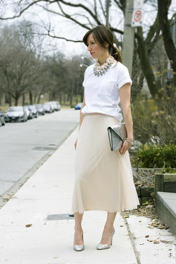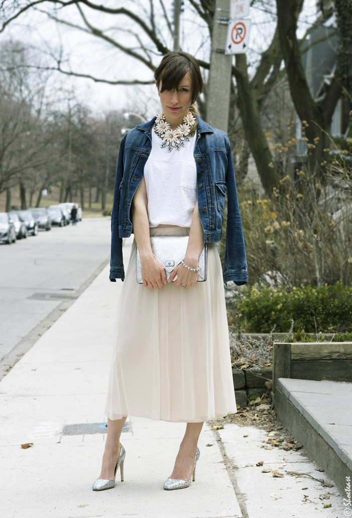 Tulle Skirt: Gap, old. Glitter Pumps: Jerome C. Rousseau “Aizza” on sale. White Tee: Gap on sale. Jeans Jacket: Gap. Daisy Necklace: Joe Fresh . Crystal Necklace: SammyDress. Chain Bracelet: Banana Republic. Stud Earrings: Winners. Silver Clutch: Milly.