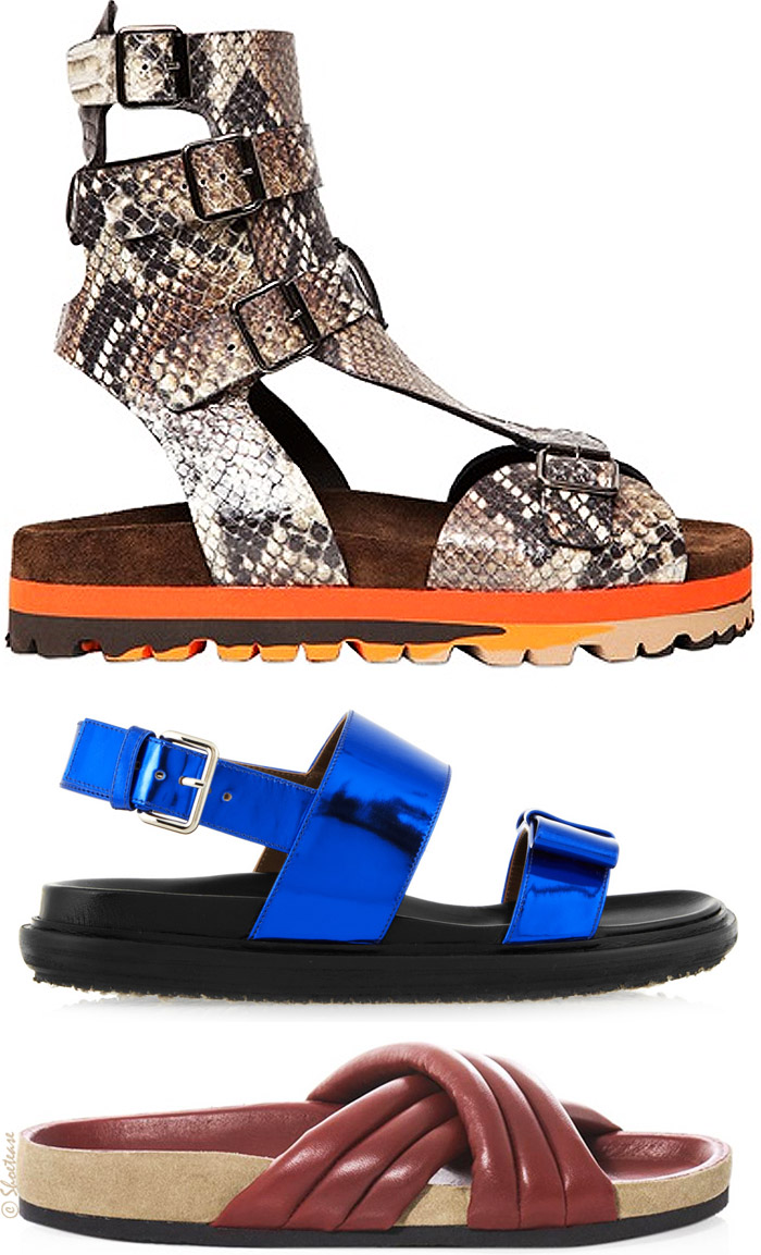 Top to Botton: MSGM python sandals, Marni cobalt-blue mirror sandals, Isabel Marant “Holden” slides