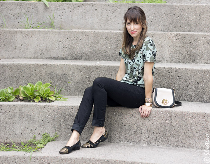Vintage Loafers: vintage Sergio Ross. Black Jeans: Gap. Camo Tee: Joe Fresh. Purse: Emma Fox. Necklace: Banana Republic, old. Gold Watch: Aldo. Gold Rings: Aldo.