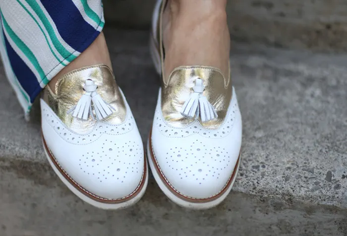 Home » Shoe Styling » Gold & White Loafers with Green Vertical Striped Maxi Dress