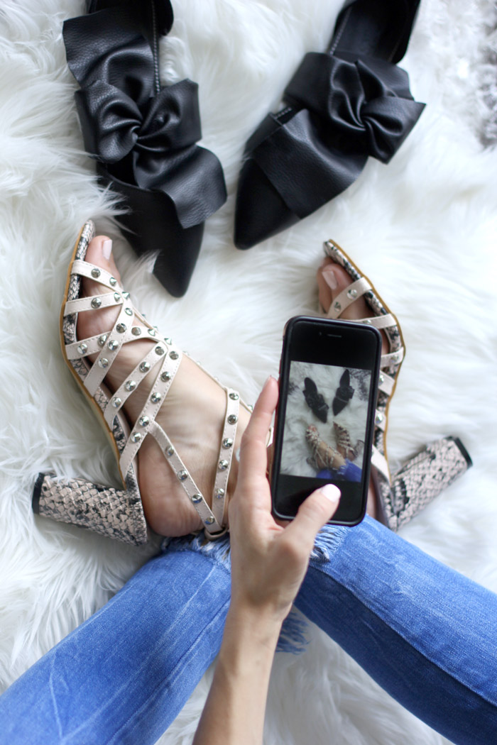 The studded block heel strappy sandals are objectively stunning. I love the added bit of Valentino Rockstud feel. The studs are shiny & captivating, while the snake print is textured & has great visual depth to it.  The 3.5 inch heels are so very walkable and considering they are made of faux leather, are extremely soft and cushioned under the toe & heels. But these didn't come to me without a few problems. If these issues are ones that less shoe savvy fashionista would likely notice, I'm not sure!